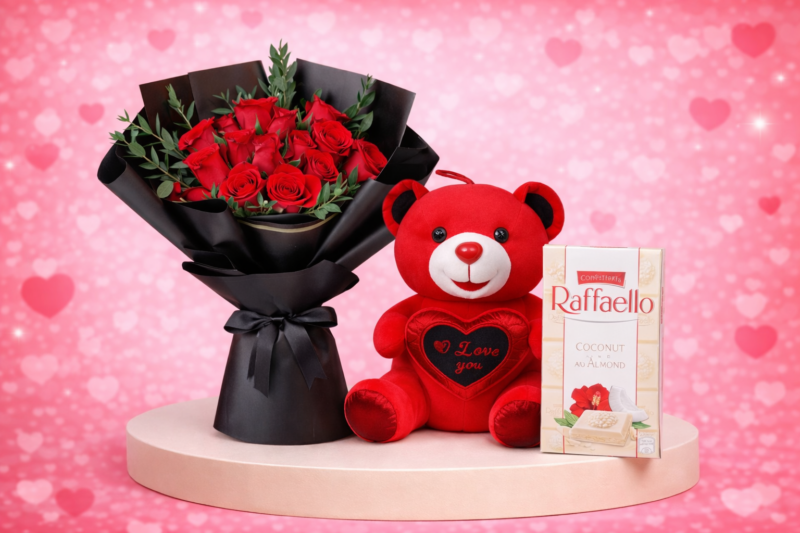 Express your love beautifully with our Valentine All-in-One Combo, thoughtfully designed to create a perfect romantic surprise. This charming gift set features a 10 Red Rose flower bouquet, Raffaello chocolates (90 grams), a cute 30 cm teddy bear, and a personalized message card to share your heartfelt feelings.
