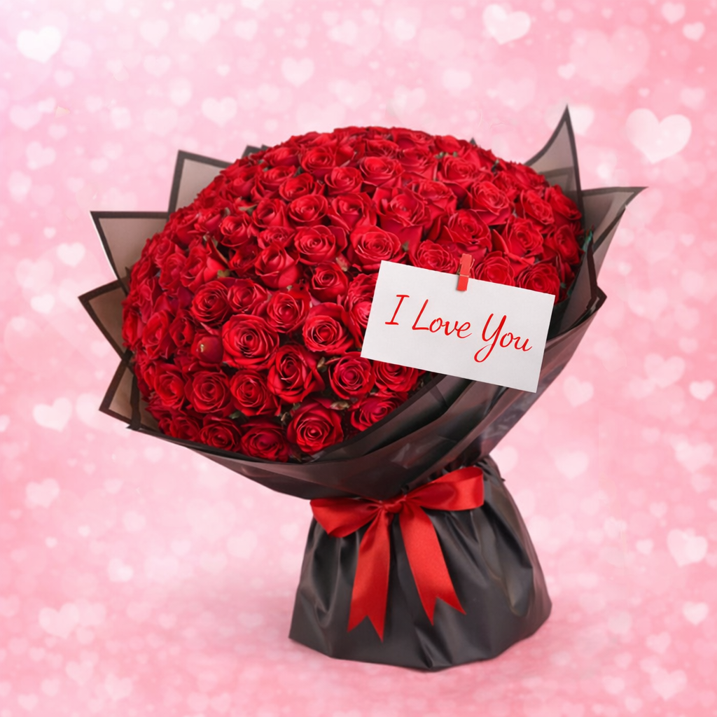 An opulent bouquet of 101 fresh red roses, beautifully hand-arranged to create a breathtaking expression of love and passion. Each rose is carefully selected for its rich color, velvety petals, and long-lasting freshness. Wrapped elegantly and finished with premium detailing, this grand bouquet is perfect for romantic occasions, anniversaries, proposals, Valentine?s Day, or making an unforgettable statement. A timeless symbol of deep love and devotion that speaks straight from the heart
