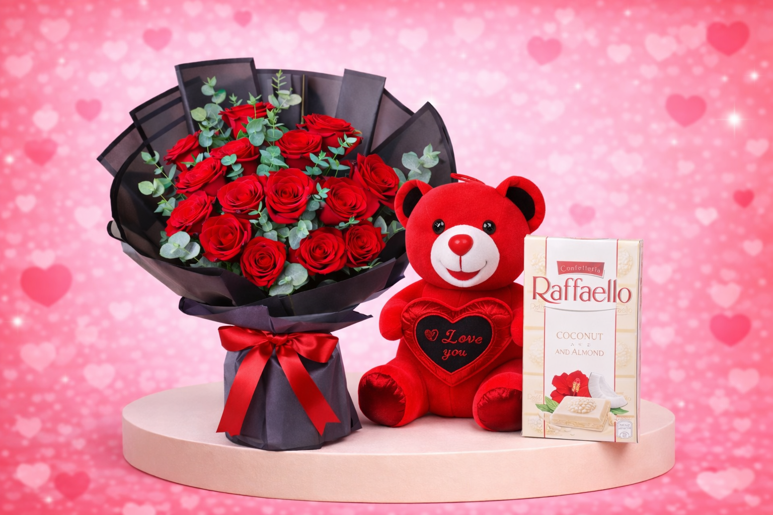Express your love beautifully with our Valentine All-in-One Combo, thoughtfully designed to create a perfect romantic surprise. This charming gift set features a 10 Red Rose flower bouquet, Raffaello chocolates (90 grams), a cute 30 cm teddy bear, and a personalized message card to share your heartfelt feelings.