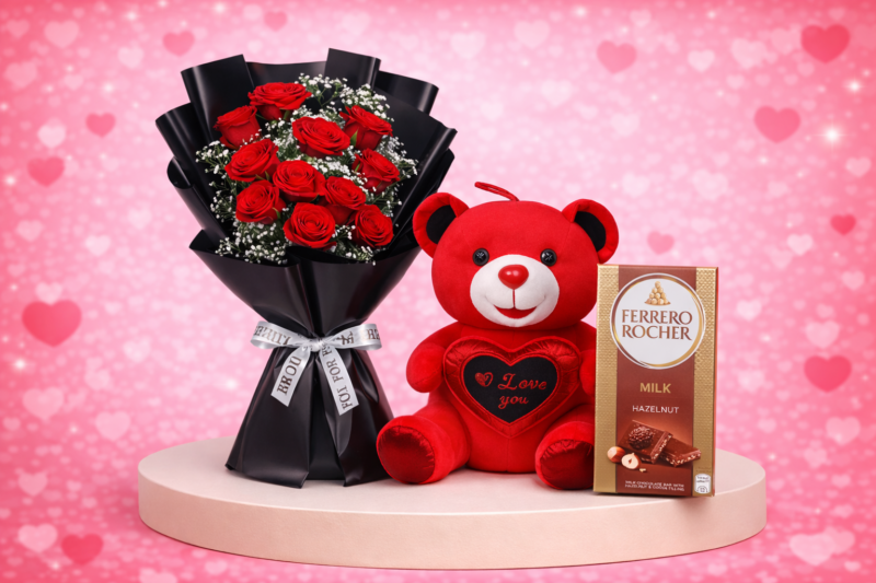 Celebrate love in the most beautiful way with our Valentine All-in-One Combo, perfectly curated to make hearts melt. This elegant gift set includes a 10 Red Rose flower bouquet, Ferrero Rocher chocolates (90 grams), a cute 30 cm teddy bear, and a personalized message card—everything needed for a memorable Valentine surprise.