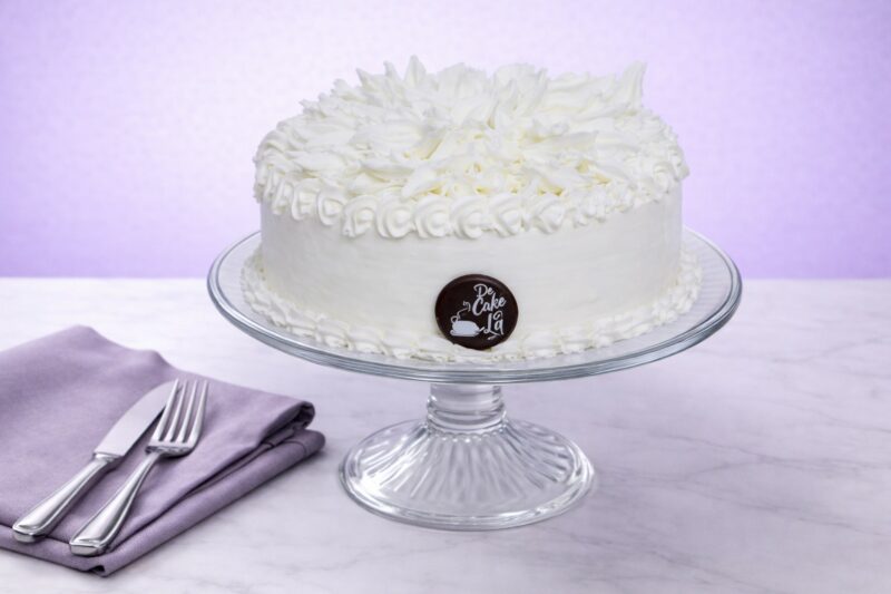 Soft and moist cake layered with creamy white chocolate frosting, a smooth and elegant indulgence.